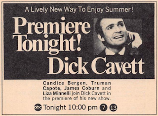 There's another program note that runs through the week: the debut of Dick Cavett's new thrice-weekly primetime show (10:00 p.m., ABC). It's the latest landing spot for Cavett, whose 90-minute Monday-Friday daytime show ended in January after a little less than a year; it was always problematic that a show with Cavett's relatively intellectual heft would make a go of it as a morning series. The series kicks off on Monday at 10:00 p.m. PT, with Truman Capote, Liza Minnelli, James Coburn, and Candice Bergen; in later weeks, it will air on Tuesdays, Wednesdays, and Fridays, running throughout the summer. I think there was always a thought on the part of the network that Cavett would serve as a backup in case Joey Bishop's show failed, but as it happened, Cavett was thrust into the late-night spot earlier than expected, when Bishop quit in a contract dispute; he slides into the role at the end of 1969.And the Apollo 10 flight comes to an end this week with the splashdown scheduled for Monday; all three networks plan live updates throughout the weekend and on Monday; NBC's Today expands to three hours for the event, including an appearance by "Harvard medical student Michael Chrichton [sic], discussing health problems that could be created by interplanetary travel." It's too bad that Apollo 10 tends to get overshadowed by the flights of Apollo 7 (first successful Apollo flight), Apollo 8 (first trip around the moon), and Apollo 11 (first moon landing), because its successful test of the lunar module in lunar orbit was essential in making the moon landing possible. And think about this: that Apollo 11 flight took place only two months later. Amazing to think all those missions could take place in such rapid succession, doesn't it?