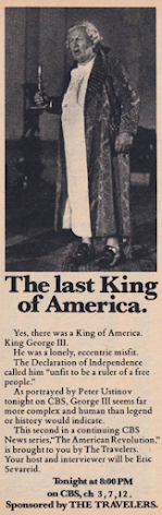 One of the treats of the week is Peter Ustinov's portrayal of King George III on the CBS News special "The Last King of America" (Wednesday, 8:00 p.m.), part of their American Revolution series leading up to the Bicentennial. If you're too young to remember, the 200th anniversary of the Declaration of Independence was a big deal in this country, even though it was somewhat stained by the aftertaste of Watergate; still, the leadup to 1976 was tremendous, and this series on the Revolution was just one of the ways CBS, and all the other networks, sought to join in. The premise gives us newsman Eric Sevareid interviewing Ustinov's George, who improvises his answers based on history and his knowledge of George's politics.Accompanying the program is a TV Guide Background article written by James Thomas Flexner, who authored perhaps the definitive George Washington biography, which was itself turned into not one, but two TV miniseries (1984's George Washington and 1986's George Washington II: The Forging of a Nation), both of which starred Barry Bostwick as Washington. In his article, Flexner provides a genuine insight into George III, explaining his family background and how, at first, George was well-liked both in England and the colonies. There are, in fact, several parallels between the Revolution and the American war in Vietnam, including how support for the war was initially quite strong in England, and how George was laid low by increasing public damands for peace, which would haunt George for the rest of his life (he reigned for 37 years after the Revolution). Flexner doesn't make a point of emphasizing these similarities; he doesn't have a political axe to grind, he doesn't want to score points with any particular ideological group: he just leaves readers to see these similarities for themselves.