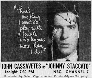 X suppose it would be many years ago now, on the late, lamented Trio cable channel, that I first saw the private detective series Johnny Staccato, starring John Cassavetes. It was part of a block of shows called "Brilliant But Cancelled," but the episode I saw must not have been very brilliant, because it gave me the impression that Staccato wasn't anything to write home about. But the end of N.Y.P.D. left a half-hour hole in our Thursday night schedule, so maybe it was time to give it another chance. And having that opportunity to view the series again has also given me the opportunity to reassess my opinion, for while Johnny Staccato may not be brilliant, it's mostly good and occasionally better than that, and it's always enjoyable to watch. (The ridiculous name of the show's hero also proved good fodder for SCTV's detective parody Vic Arpeggio, but that's a story for another day.)Johnny Staccato (NBC, 1959-60) comes from the great era of jazz detective series, which also included Peter Gunn and Richard Diamond. (I wonder, though, was there another, not-so-great, era of jazz detective series, maybe a show starring Miles Davis as an irascible, iconoclastic, go-his-own way loner, doing battle with his evil nemesis, Felonious Monk. Or was that joke too easy? But I'm afraid I've digressed.) Staccato comes by his creditentials honestly, as a jazz pianist-turned-private detective who, when he's not hunting down the bad guys, spends his time jamming with real-life jazz greats like Red Mitchell, Barney Kessel, Johnny Williams and Red Mitchell. (The show's theme, by the great Elmer Bernstein, and the driving score, supervised by Stanley Wilson, add instant credibility for both jazz and mystery fans.)
