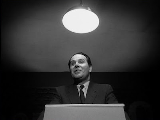 A halo, or the inquisitor's spotlight?Another very good episode, this one directed by Cassavetes, is "Evil," which opens with a striking scene: Alexander Scourby, he of the diginfied speaking voice, looking straight into the camera and intoning,"Evil attacks you through your television sets." (Talk about bitting the hand that feeds you.) Scourby portrays Brother Max, a gospel mission preacher who may or may not be a con artist; Johnny's called into the case by a relative of an old woman who's pledged all her money—both in this life and in the next—to Brother Max. Johnny's preconceived notion of guilt is shaken after talking to her; he finds not a helpless old woman but one serene in her faith and the direction her life has taken, thanks to her involvement with Max. He decides to investigate further: if the preacher's a crook, the authorities need to know, but if he's legit, Johnny needs to know; he envies the quiet certitude that he's seen in the woman. Cassavetes brings a style and panache to his direction, putting himself in the backgroud to emphasize a trio of powerful performances from his co-stars: not just Scourby, who oozes charm and smarm in equal parts, but Elisha Cook, heartbreaking as a man constantly falling back into the sin of demon drink; and Lloyd Corrigan as Brother Thomas, founder of the mission, who finds an inner strength he never knew he had when he's forced to admit to the congregation that he, and they, have been duped by Max. His transformation from a weak man worried about what his congregation will think of him to a courageous man taking responsiblity for his failings and standing up against Max is both moving and inspiring; it's also a sign of an actor's director, which Cassavetes most certainly was, the certainty of the star allowing the guests to drive the episode.