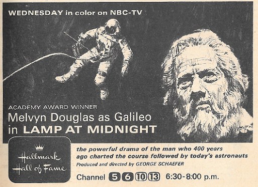 Our latest installment of "when television used to show classy dramas," presented without comment: Wednesday's Hallmark Hall of Fame presentation of "Lamp at Midnight" (6:30 p.m., NBC), the story of the epic conflict between Galileo and the Catholic Church, with an all-star cast including Melvin Douglas as Galileo, with David Wayne, Michael Hordern, Hurd Hatfield and Kim Hunter. (There's a nice color feature on the production elsewhere in the issue.) Interesting, isn't it, how the advertising tries to capitalize on the space program to attract viewers to a story that occurred 400 years ago?