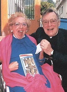 Fr. Townes and a parishioner, 1986He began taking philosophy courses at UCLA, then, while continuing his acting career, he put himself through seminary at the Bishop Bloy School of Theology in Los Angeles. He was ordained as a transitional deacon in 1973 and then, at age 59 and after ten years of study, he became Father Harry Townes in a ceremony at St. Paul's Episcopal Cathedral in Los Angeles on March 16, 1974. He was a nonstipendary priest, meaning he would continue to earn his living as an actor and would take no salary as a priest. There was, he felt, no conflict between acting and the priesthood; "The theater, too, is for goodness, truth and beauty." For his first assignment, Father Townes was sent to St. Stephen's in Hollywood, where he worked with "alcoholics, dope addicts, and prostitutes," as well as those in need of spiritual help. "This is not my permanent parish," he explained to a journalist. "I might be assigned to other parishes at any given moment. And this is the way I desire it. I still want to continue my life as an actor as well as serving my fellow man."