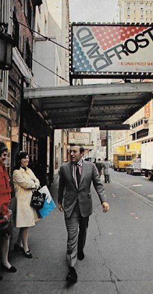 He's not everyone's cup of tea, though. His attentiveness, which works so sucessfully in drawing his guests out, can border on sycophantic. His favorite closing line, "It's been a joy having you here," has become the butt of jokes, and New York Times TV critic Jack Gould acidly described him as "deferential enough to be an assistant to a television vice president." Meanwhile, across the pond, the British, for whom Frost was a popular and dreaded satirist (That Was the Week That Was) with a reputation as fierce as Mike Wallace, wonder whether he's sold out to the cousins. Geoffrey Hobbs, TV critic for the London Evening Standard, says that the old frost would tear people apart. But now, "The David Frost interview started becoming a show-biz chat show—very pally. Now, he's gotten a bit plasticky—the smile too much in evidence. . ." This last part is up for debate. His friends insist he hasn't soften—as Clay Felker, editor of New York magazine puts it, "he uses a more sophisticated technique—of questioning people so that they hang themselves!" And British producer Peter Baker points out that TW3 was a scripted show, produced by a writing staff. "[I]t wasn't him talking!" (You'll notice that people around Frost tend to talk in italics a lot.) Others note that, like so many comic actors, Frost has simply traded in his comedic chops for a more serious milieu.