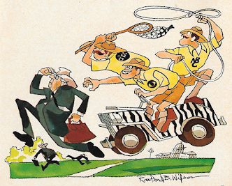 But now, of course, we're in the era of the war on violence (no pun intended), one of the lasting (for now, anyway) legacies from 1968. Networks have promised, under pain of government oversight, to clean up their act and provide entertainment that was at least a little bit kindler and gentler. Pflug doesn't mention any of this, merely decring the acts of the "do-gooders," the "infernal ladies' clubs and their write-in campaigns," but it's the background to the situation in which he now finds himself. "All but gone are the days when TV heroes returned from the edge of the grave to gouge and bit their way to happiness in the final 10 minutes before the kiddies were put to bed." When the hero laments that the villian is simply a product of his environment, that's when Pflug draws the line, storming out of the house to punch a couple of trees lest he do something even more disagreeable while inside.And that's when he overheard a conversation between two men, discussing the same show he'd just been watching. "I've seen terrible in my time but never so terrible as that," said one man. His friend replied, "When that rat told the hero he'd stolen his dog and sold it to a laboratory, I thought sure he'd bought himself at least a karate chop. But the guy just stood there and said, 'I feel sorryh for ayone with so much hate inside.'" I feel his pain, even though the characters who actually deserIt've to feel pain manage to avoid it.