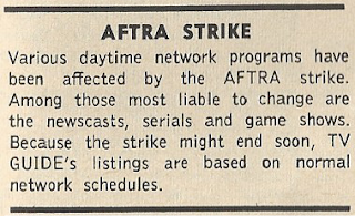 IIn the past, we've seen issues of TV Guide where circumstances have contrived to make programming listings subject to change. Most of the time the changes are caused by news coverage of breaking events, but this week we have something completely different: the strike by AFTRA, the American Federation of Television and Radio Artists, which has already thrown the networks for a loop and threatens to complicate things for an indefinite period of time.The strike, which all in all ran for 15 days, was actually settled by the time this issue hit the newsstands*, but at press time there was no telling when the end was going to come; thus, almost every other page contained some variant of the warning that programming—mostly newscasts, soap operas, variety programs and game shows—was being affected due to the AFTRA strike, and therefore might change. However, "[b]ecause the strike might end soon, TV GUIDE's listings are based on normal network schedules."