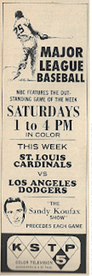 Ready for some sports? The baseball season has opened, and NBC kicks off its Game of the Week coverage with the defending National League champion Los Angeles Dodgers taking on the St. Louis Cardinals, who will win this year's National League title (as well as the World Series). Newly retired Dodgers ace Sandy Koufax joins the NBC broadcasting team; Koufax was never a good fit in the broadcast booth, and he leaves NBC after the 1972 season.The Minnesota Twins open their local television schedule on Friday night with a game against the Detroit Tigers (6:55 p.m. CT, WTCN and others). These two teams finished second and third in 1966 (behind the champion Baltimore Orioles), and they'll be key players in the four-team death match for the 1967 American League crown. The Twins plan to telecast 50 games during the regular season on WTCN, although they'll be adding some at the end due to the pennant race. Interesting how times have changed, isn't it—nowadays, between OTA and cable, almost every team televises almost every game.