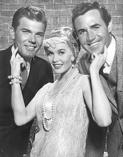 (L-R) May, Provine, ReasonPeople sometimes accuse WB of operating an assembly line of cookie-cutter series, but this just isn't true at all. After all, the other shows I mentioned all focus on private investigators, but The Roaring 20s clearly breaks the mold by giving us two newspapermen—Rex Reason as beat reporter Scott Norris and Donald May as columnist Pat Garrison—who, in the course of their reporting day, just happen to act like detectives by solving crimes. Now we're obviously talking about a different genre here. And as their female sidekick, Pinky Pinkham, Dorothy Provine cuts a figure far different from Connie Stevens of Hawaiian Eye; sure, they might both be singers, but Dorothy dances as well, and she owns the Charleston Club, where everyone hangs out when they're not breaking news or solving crimes. Only a pseudo-intellectual could possibly confuse the two. Finally, whereas the other WB detective shows were set in contemporary, glamouous locales like Hawaii, Florida and New Orleans, The Roaring 20s takes place in New York City in, well, the 1920s. There is one way in which all these shows are alike, though: they're all dumb fun to watch. I don't mean they're stupid, or that the people watching them are stupid, though certainly some of us are. No, like the other shows from the WB factory, The Roaring 20s doesn't present intellectually stimulating puzzles a la Sherlock Holmes, or feature angst-ridden antiheroes or tackle allegorical social issues. What it does do is give the viewer an hour (minus commercials) of entertainment built around a core of likeable characters whose job is to track down the bad guys before they get away with murder, with just enough period details to remind you that you're in a world where Prohibition is still the law of the land but there isn't an Eliot Ness around to enforce it. And while I'm not sure about you, I can really use that kind of entertainment these days.