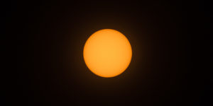 Next up. Practice. Great piece of advice. A few weeks before the event, I put the filter on the lens and took a few shots of the sun at different times of the day. Noted the settings, etc. The hour and twenty minutes before and after totality were a concern, but I would have lots of time to adjust. The hardest part would be readying myself for the whopping couple of minutes of totality. I knew that just before totality, I would have to remove the filter, risk taking unfiltered shots of the “diamond ring,” then Bailey’s Beads, and finally totality. Same as the sun emerged on the other side. There was no real way to practice this. One of my test shots: