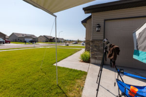 Here was my set-up in Idaho Falls, Idaho on 8/21/2017. At about noon, I set-up my tripod, camera, filter, chair, etc. and waited. It was hot by Idaho standards (low 80s). Behind me, private jet after private jet flew into the Idaho Falls Airport. Apparently, clouds were obscuring the event in parts of Wyoming (Jackson), so the top 1% got in their planes and flew into an oversubscribed Idaho Falls airfield.