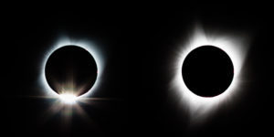 The part that worried me the most was removing the filter and attempting a few shots just as totality occurred. I wanted to capture the diamond ring and was pretty sure it was safe for my camera, but I’d never done this. Once totality occurred, I rapidly took shots varying my shutter from 1/2000th up to 1/50th of a second, all at f/9.0. Most of the nicer shots were in the same range as when I used the filter. The one mistake I made in all of this: in my excitement through totality, I never refocused like I did before and after totality. Hence, I could have recorded slightly sharper totality images, but they were certainly good enough for me. Here’s one going into totality–the diamond ring, and of course, the star (haha) of the show–totality: