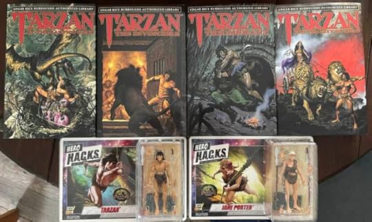 April is Tarzan Month with the arrival of the Edgar Rice Burroughs Authorized Library, Tarzan volumes 13-16, with gorgeous covers by Joe Jusko, and the just-delivered and totally awesome Tarzan and Jane figures from Boss Fight Studios!