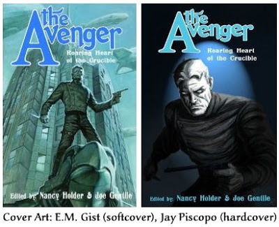 The Avenger: Roaring Heart of the Crucible features stories by New Pulp Authors Matthew Baugh, James Chambers, Greg Cox, Win Scott Eckert, Joe Gentile, CJ Henderson, Nancy Holder, Michael May, Matthew Mayo, Will Murray, Bobby Nash, Barry Reese, Chris Sequeira, John Small, and David White. Edited by Nancy Holder and Joe Gentile. Cover art courtesy of E. M. Gist (soft cover) and Jay Piscopo (hardcover).