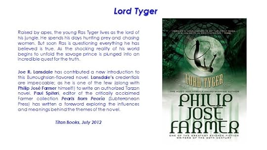 At the Dum Dum, I'll be giving a talk about Burroughs' influence on another famous science fiction author, Philip José Farmer , on Friday, August 3, at 2:00 PM. And I'll have a table in the Dealer's Room at which I'll be selling the new Meteor House edition of Farmer's authorized novel Tarzan and the Dark Heart of Time (available for the first time in hardcover!), as well as some of my other books.