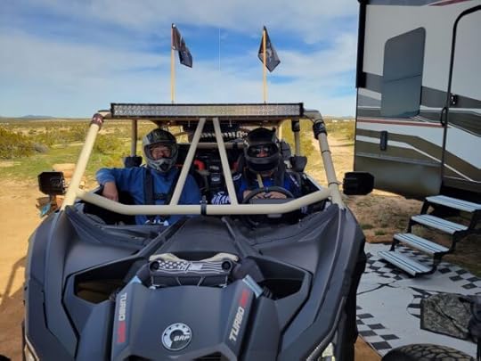 For fun, we went for rides in the Can-Am offroad vehicle. Wizard likes it well enough, but I love it! My son is experienced, and he rips out the factory safety equipment and installs his own. I trust him. The fastest that I saw we got up to was 85 miles an hour. Plus he goes over all the whoops (evenly spaced bumps) and the harness we’re strapped in holds us. It’s fun if you trust the driver