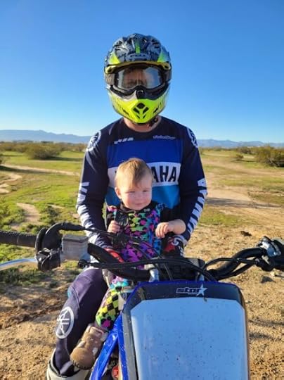 My son also rode his beloved dirt bike, and Cigi loves watching him. When I went to watch him jump, she was pointing at Daddy every time he jumped. Here she is with him (he obviously doesn’t ride with her on there — she also doesn’t go in the Can-Am. She’s just too young and it’s not safe for her.):