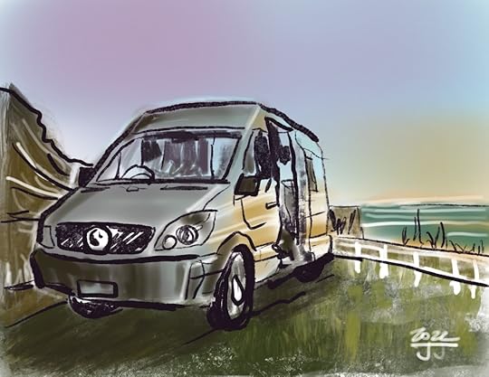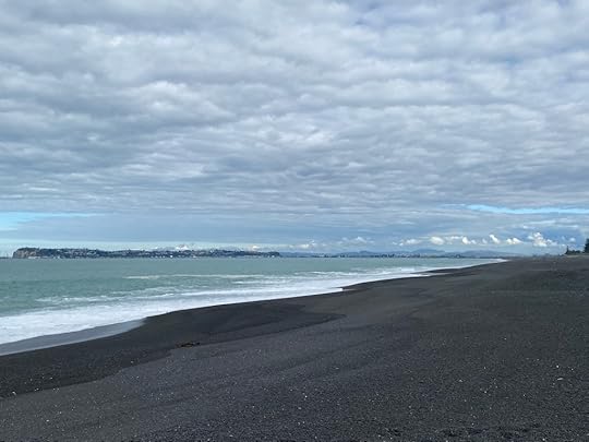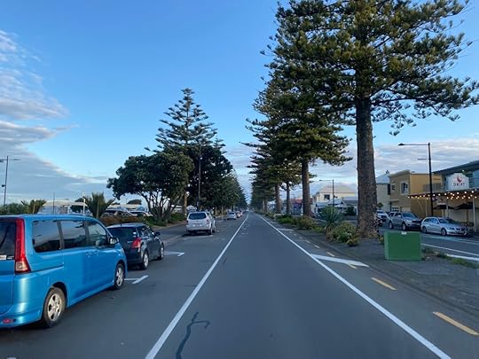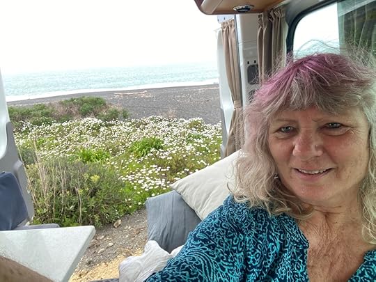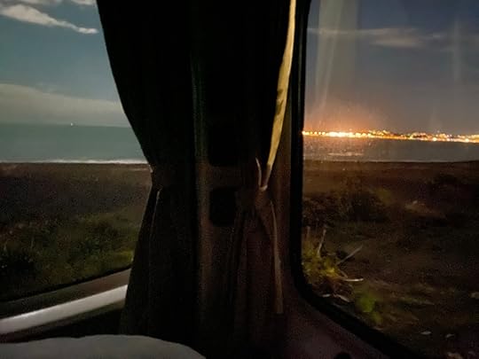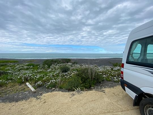 Napier beachYes, on a lonely skyline. My brother Steve has a powered site just further down, but this one is so new they haven’t installed power yet. I don’t mind – I’m practicing for later, and I have an amazing view: