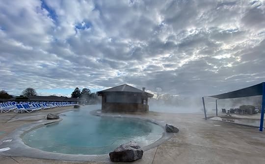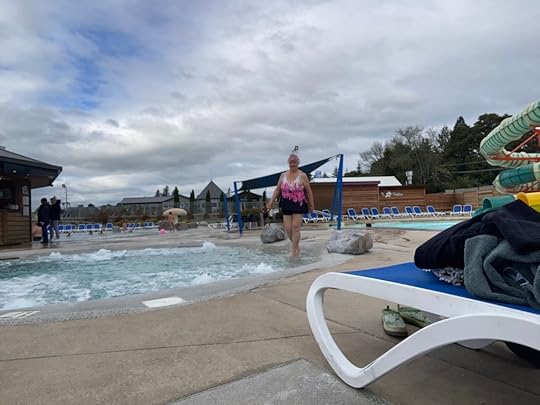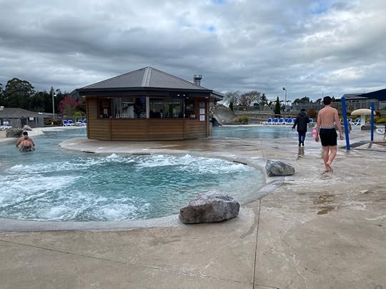 Before long we headed in for our first hot swim in these natural spring baths – complete with a bar/restaurant that serves food from either the pool side or behind. I had a non-alcoholic cocktail to celebrate. We soaked until we shrivelled.