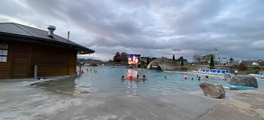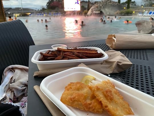 “Chink”It didn’t seem much later that we were heading back to the pools to order some dinner – fish and kumara (sweet potato) chips. Mmmm. Starting to feel quite cold and shivery, so as soon as they were downed, we were back in the hot pools as the dusk and dark cloudy skies descended, and the lights lit up the water all around.