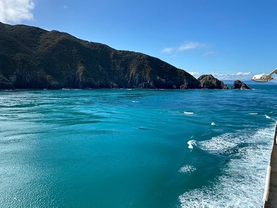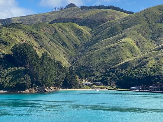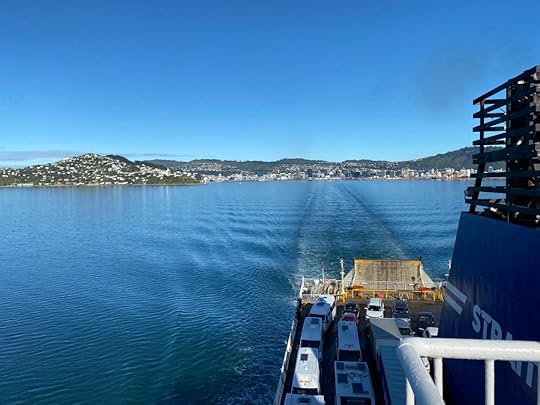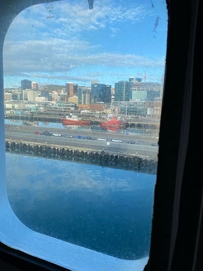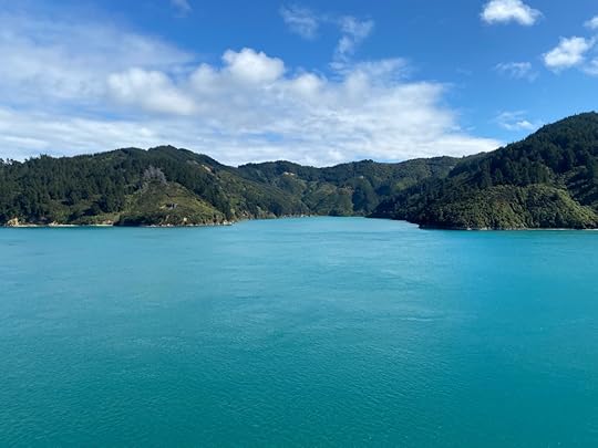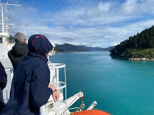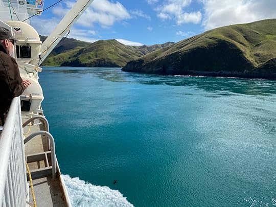 Once we moved out into the strait, I moved up into my cabin and cast myself down on the bed for a power nap. So lovely with the gentle rocking of the waves. After the nap I had a shower in the ensuite, and then headed down to the cafeteria for water, and the outer decks to check out the view as we approached the spectacular Marlborough Sounds, which lead into Picton.