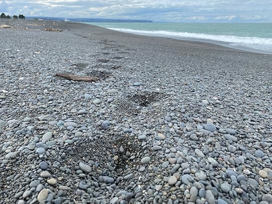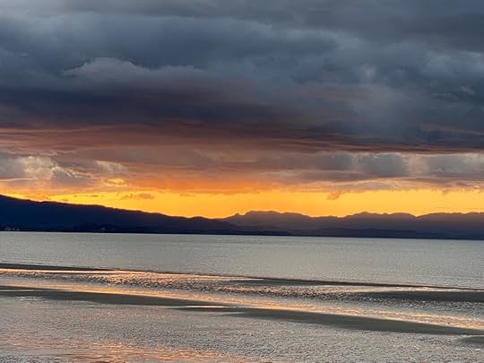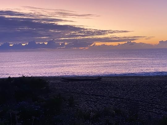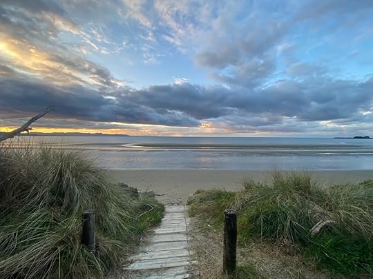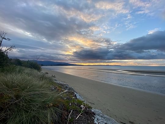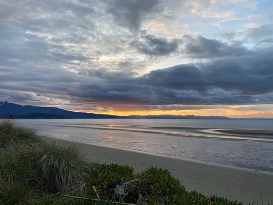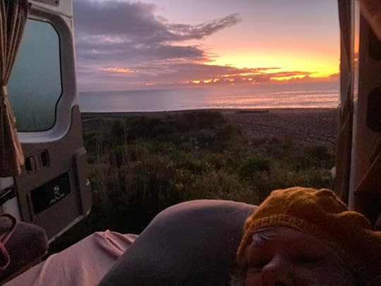 The road levelled out and I could drive faster, and after what felt an interminable time, I drew into the small township of Taikaka, (where I will go tomorrow to fill up on diesel.) I was too late to book in with the office, but they are relaxed enough here to let you get a powered site and pay tomorrow. So I’m backed up against the beach, and powered up, and have eaten a delish dinner of miso soup, toasted sandwiches, and small salad. And taken a brief walk to the beach to appreciate the sunset.