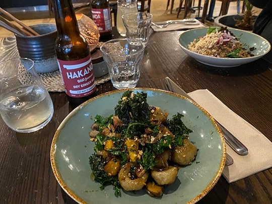 I am now tucked up in a cosy bed with a view of the moonlight glinting on the dark ocean, and the sound of the waves on shingle. Steve and I went off to see a bit of Napier earlier and drove along the main beach promenade before returning to a cafe recommended by fellow camper vanners. Milk and Honey was a great choice. Kind of Asian Fusion and a perfect way to end the day.