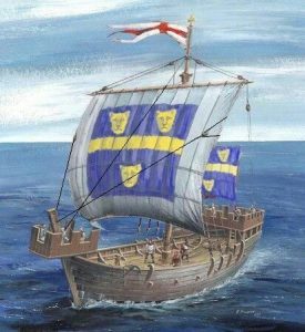 Close to the beginning of ‘All the Winding World’, a ship of reluctant conscripts sets sail on a fool’s errand to fight for King Edward I in Gascony. The ship is a cog – the workhorse of the medieval fleet. It could hold 12 horses, and perhaps 30 men, plus tonnes of cargo. It had one central sail, and when heading off to war, it would be equipped with platforms fore and aft designed to hold men fighting in battle, or archers shooting at other ships. These platforms were known as castles.