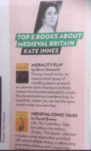 This week I had the privilege to share my opinion about other people’s books in The Big Issue , a publication for which I have a great deal of respect. I was asked to select my ‘Top Five Books about Medieval Britain’. It was not easy making such a selection, but I was glad to have the opportunity to share books that have inspired me, and that I feel deserve a wider readership. (Readers, it seems, can be ships too!) I chose Morality Play by Barry Unsworth, Medieval Comic Tales by Derek Brewer, The Hanged Man by Robert Bartlett, Company of Liars by Karen Maitland and The Time Traveller’s Guide to Medieval England by Ian Mortimer.