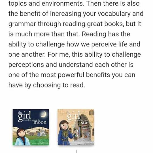 Shereen Malherbe: The Girl Who Stitched the Stars is the second book in the series, following on from The Girl Who Slept Under the Moon. It follows Noor, a Palestinian girl who moves from the East to the West, and shows how her differences can be celebrated through sharing and telling stories. It is designed to encourage children to celebrate this difference, break down barriers and learn more about each other.