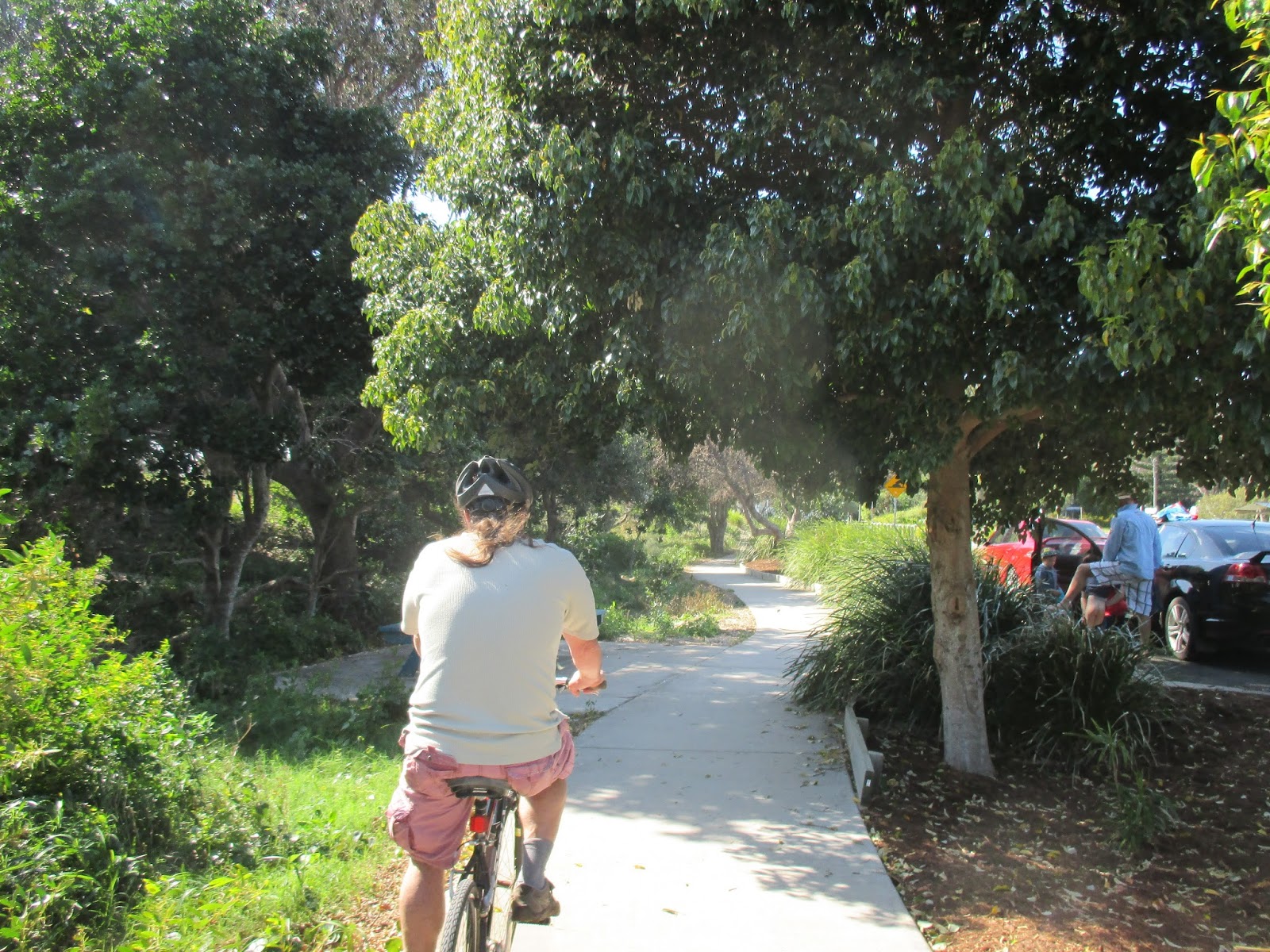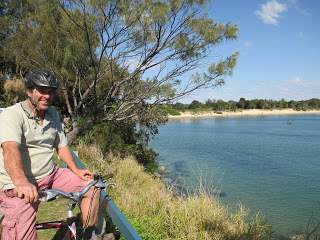 Rising early we hit the highway with next to no traffic on it, the Grey Nomads were still having breaky in the stopping bays on the side of the road, along with the wallabies and flocks of rosellas, cockatoos and magpies. 'Macca All Over' was murmuring on the radio - and as anyone knows, there no trip on a Sunday morning in Aus without Macca accompanying you - and within the hour we had arrived in sleepy Yamba with a crystal blue sky above us and shimmering blue Clarence River beside us. Parking the Jazz at the very outskirts of the village, we unloaded the bikes and once over the Oyster Channel bridge, found ourselves pedalling along fabulous wide bike paths that would have to be some of the most well maintained and picturesque I've ever ridden along.