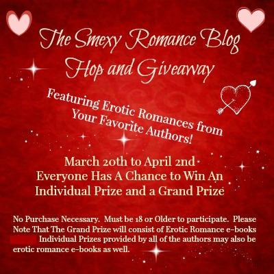 I'm also doing a giveaway. The Smexy Romance Blog Tour and Giveaway. Every person has two chances to win! An Individual prize and a Grand Prize. One lucky winner will receive an erotic romance of mine from my library and can also win the Grand Prize- A free erotic romance from every author featured on this blog tour! Keep reading for your chance to win!