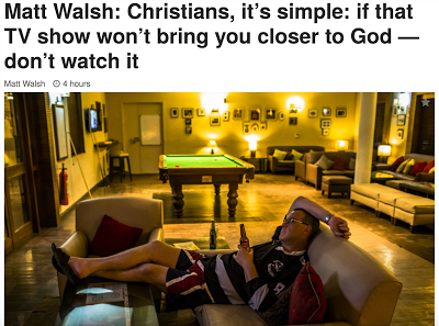 Here's Matt Walsh's post on the subject. Years ago, a friend recommended, "The Ring." I watched it, then spent a week of insomnia waiting for a dead girl to crawl out of my TV.I'm not glad I freaked out for a week, but, then again, I am. It forced me to seriously rethink my entertainment choices and their impact on my thoughts, views, and peace.What I've discovered is that the more distance I put between myself and the glorification of sex, death, and gore, the more I see how it impacts me when it crosses my path again. I'm not only generally disturbed, I'm angry. So, I shut off my tv. Then I yell at it. And it soothes my rage.If we think our entertainment is harmless and has no impact for good or bad, we've swallowed a lie. And if we think, 'oh, it doesn't bother me,' we've washed down that lie with personal deception. We're either lying to others or ourselves because, yes, it does affect you. If you aren't noticing it, that means you've allowed it to root itself in who you are. It means it's affected you far more than what you even realize. It means you need to start noticing now and fast.The environment, the words, and, yes, the entertainment we surrounded ourselves with impacts how we view our life, our beliefs, our world, and even our personality. Whether unconsciously or not, we often take on characteristics and mannerisms of the characters - or reality stars - we watch. This is how movie one-liners become part of our cultural dialect.Entertainment also puts thoughts in our heads that simply should not be there, especially as a Christ-devoted example to our friends, coworkers, and family. Christ is holy. Above all else. Holy. What are we saying about our love of God to those around us who witness us easily discard that principle for a good time?What I'm saying is, our entertainment choices matter. Really, really matter.I'm not telling you to resort to watching reruns of "Little House on the Prairie," although a few episodes of that show wouldn't hurt anyone. And I'm definitely not saying I've got the list of "approved" and "banned" TV shows and movies to pass around. But I do believe we should be considering what we're consuming before pushing play. And we should be willing to turn it off for moral reasons, not just entertainment value ones.