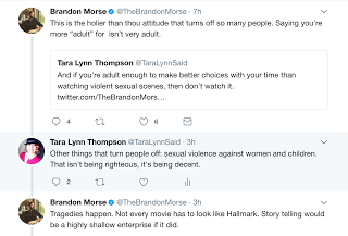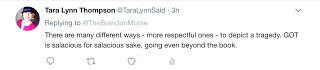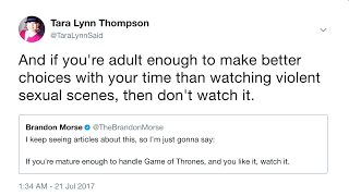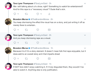 Today, I had a long Twitter exchange - which I never do - with a journalist and Christian about #GameofThrones. He defended the indefensible because, dude, it's really good tv.