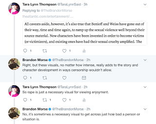 A story in The Atlantic, the one I quoted above, outlines several ways the writers have gone far beyond what was required for the story or the character in their illustration of sexual violence. They've purposely added even more than the book series outlined and all for what purpose?