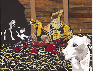 30 Days of Night creator, Steve Niles has a few pieces of original art on ebay right now to benefit his dog, Sonny who has been weathering some chemo treatments. Among the artwork is the above original cut paper collage that I made based on John Carpenter's The Thing (1982) with Sonny in the foreground.