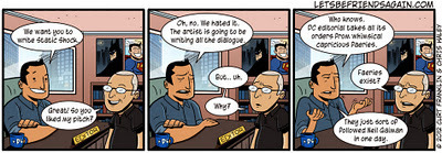 As a side note, some people read into my comment about looking for work from other publishers when I left Static Shock as some veiled hint that all was not good between DC and I. As anyone who freelances could tell you, new projects take months to reach the point where actual work is being done on them, and anyone is being paid. While I do have projects under consideration at DC, I'm still interested in working on other things. Since Static Shock, I've been concentrating my efforts on a project outside of comics which I can't announce yet, but was a nice change of pace. I'm still looking for things to do with other publishers as well, and am always willing to consider projects.
