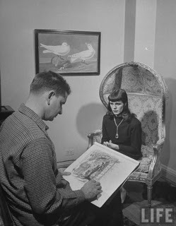 Today is the 100th anniversary of cartoonist Charles Addams best known for his macabre cartoons featuring a family of characters which would become known as "The Addams Family." Here, using his first wife, Barbara as a model for Morticia, he sketches one of his cartoons. Charles Addams collections at the library caught my attention as a kid because of the subject matter and were probably my first exposure to black humor.