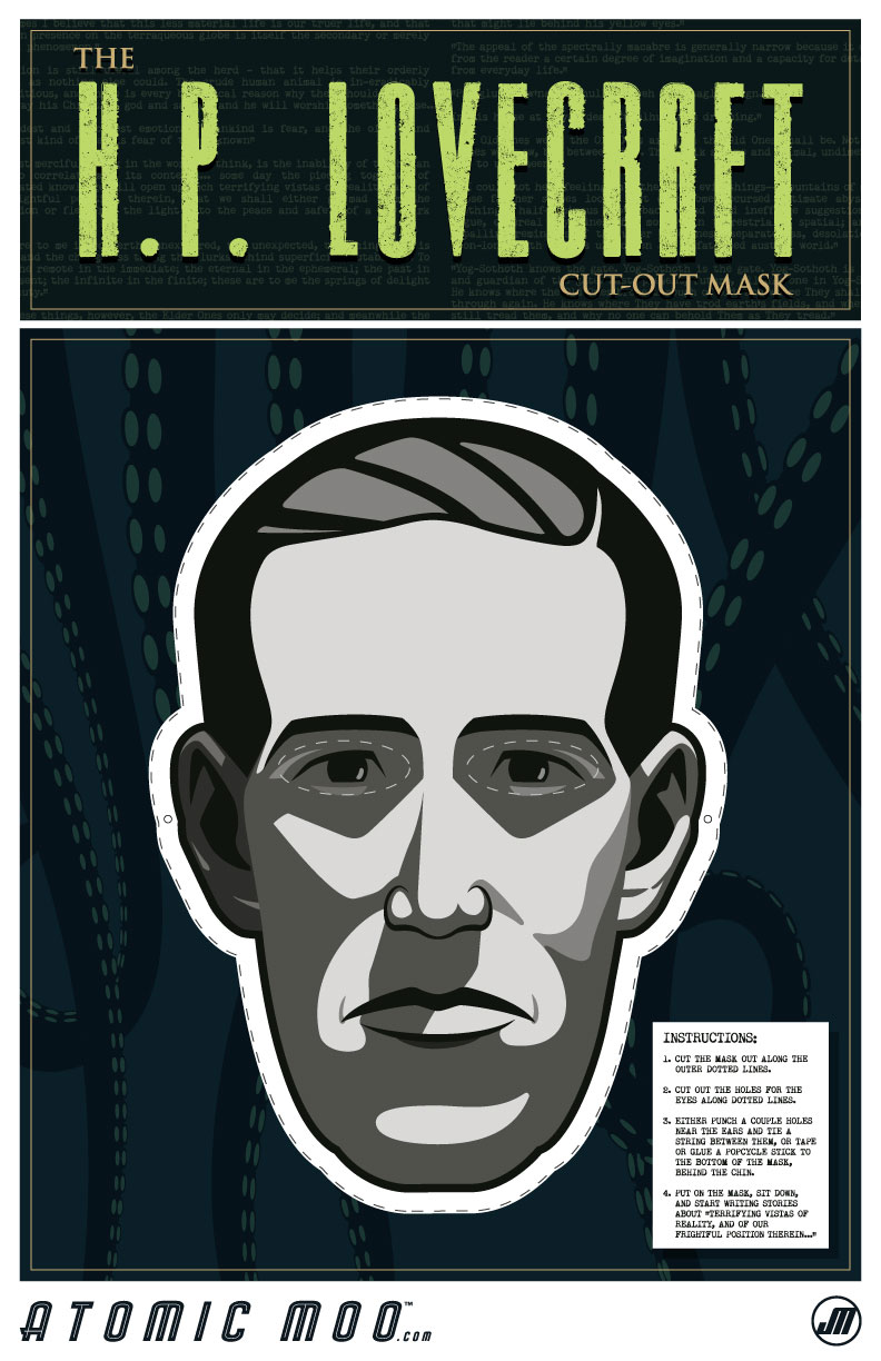 Today's print and cut out mask is H.P. Lovecraft by Atomic Moo. They also have one of Edgar Allen Poe. You can download both here