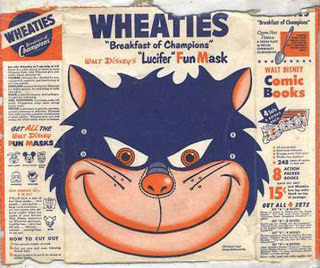 For the Disney fan, here's mask of Lucifer, the nasty cat from Cinderella taken from an old box of Wheaties. You can also find some print, cut-out and color masks of characters from Monsters, Inc. here.
