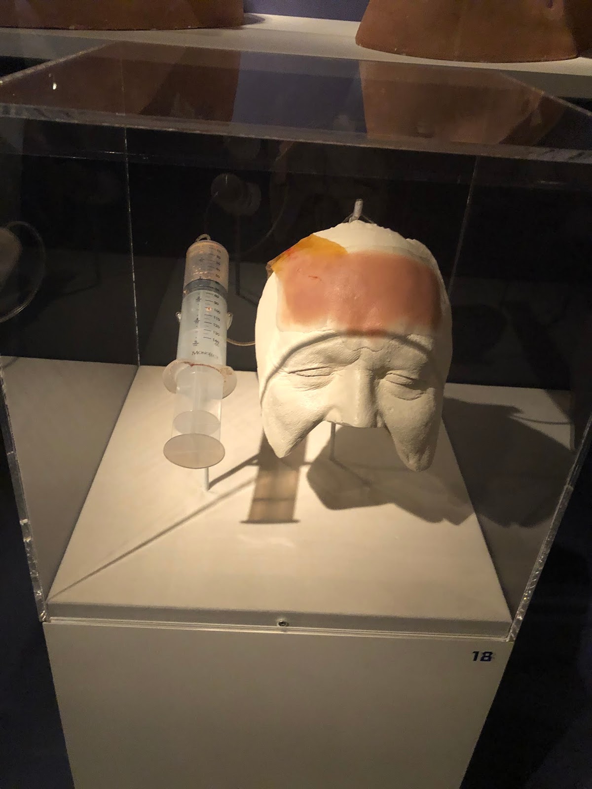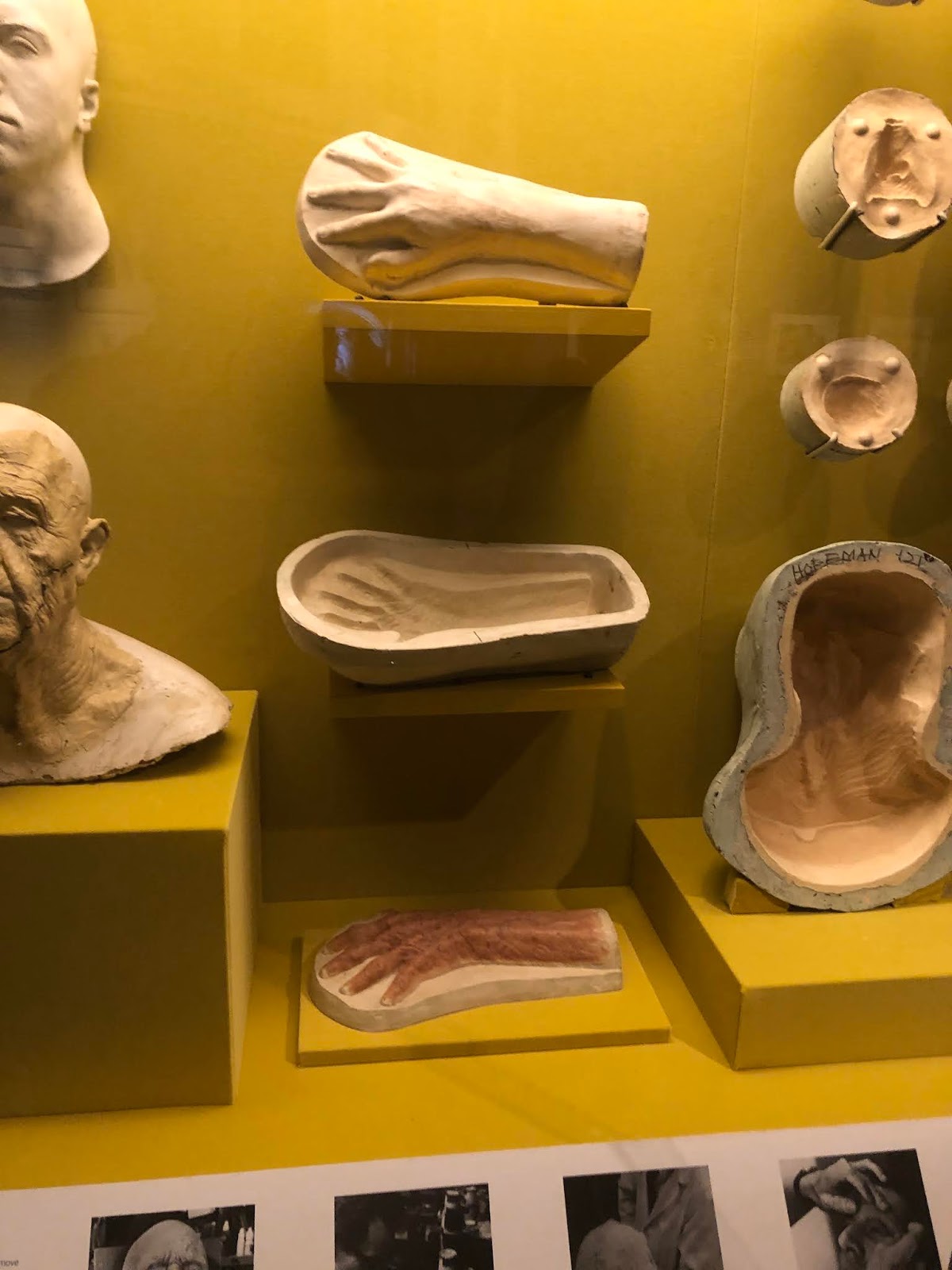 I'm usually pretty good about taking photos of the info placards, but I may have been museum out at this point as I only have a few. What the above photos from the permanent collection show are various make-up masks and appliances including Chewbacca, Jim Carrey from The Mask, A number of life casts, molds, and appliances by the legendary Dick Smith, a bleeding scalp prosthetic from The Wrestler, A reproduction Bride of Frankenstein wig (I', not sure what for), life cast and sculpts for The Elephant Man, legs from Black Swan, and drawings and models for Silence of the Lambs.
