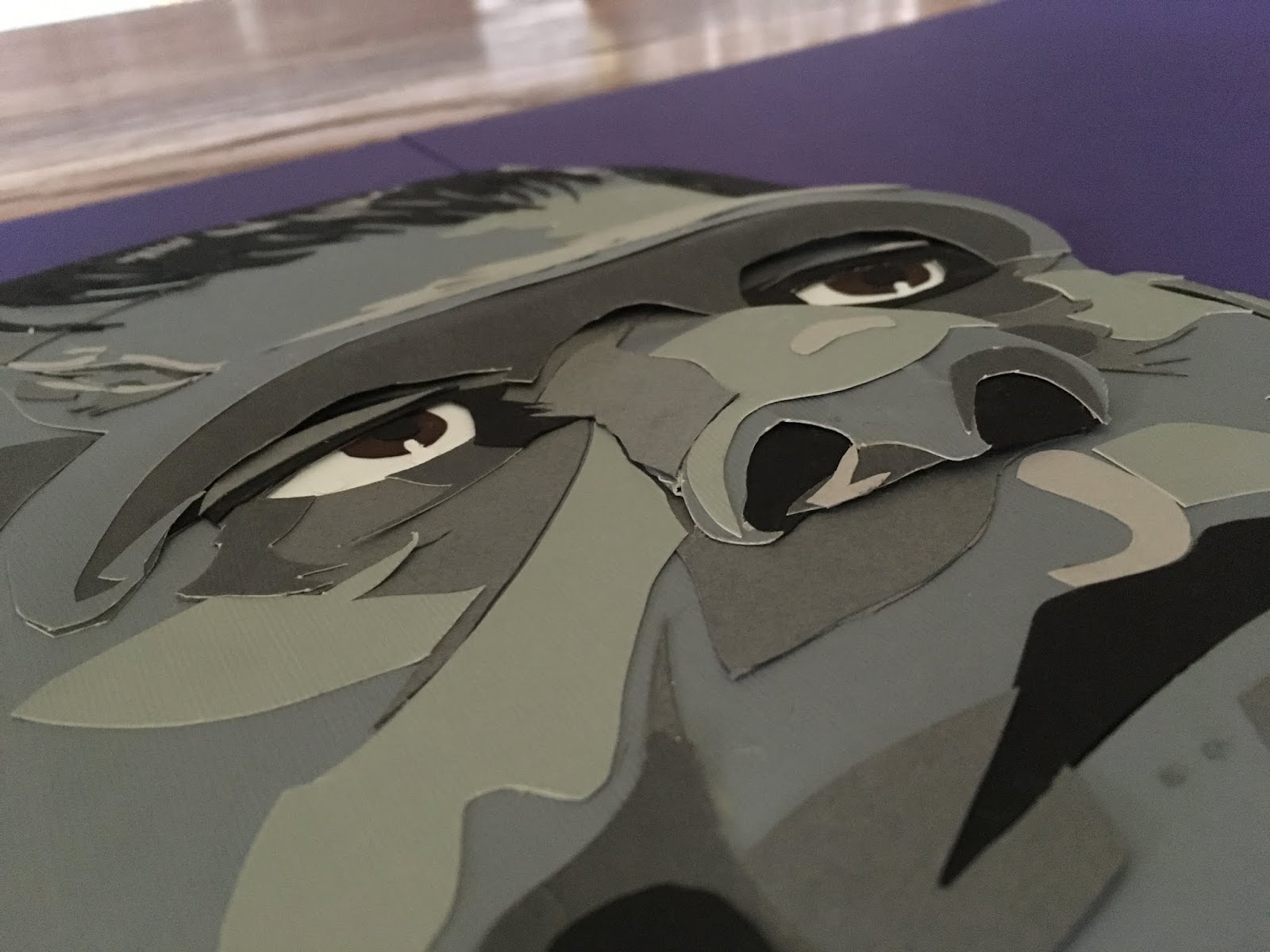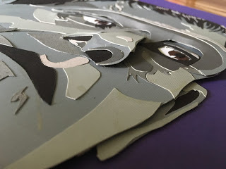 This was constructed in 3-D cut paper. The 3-D is subtle, but as seen in the first two photos with the switch in lighting, still pretty apparent. If you are in southern California, stop by the gallery and see it in person.