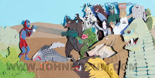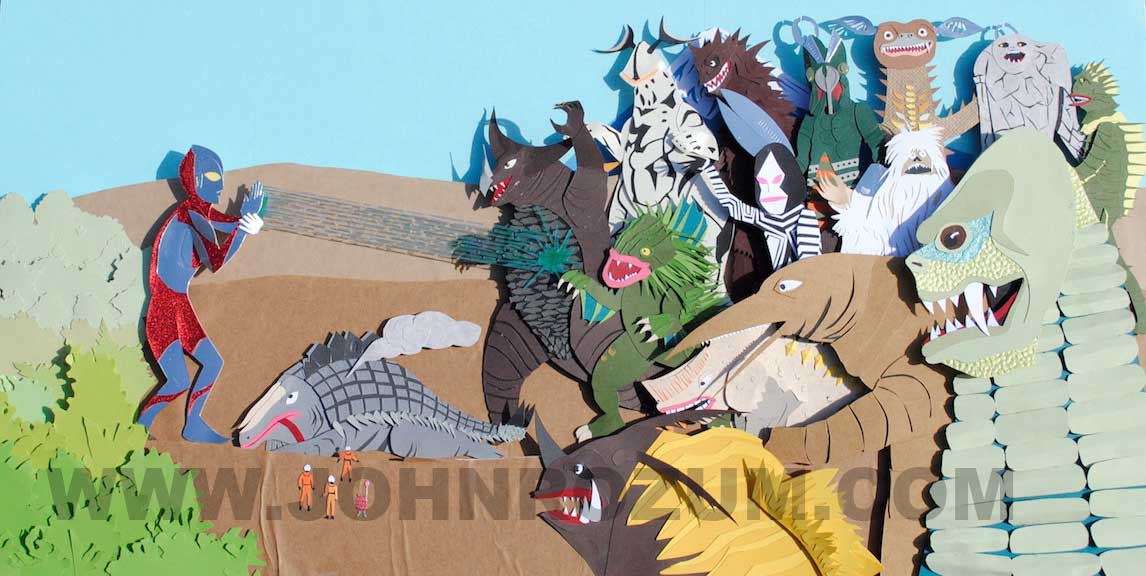 Here's my piece for the Idiot Box show opening at Gallery 1988 (West) tomorrow night. Ultraman versus a number of his foes. 3-D cut paper.