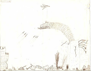 Based on the drawing style I'm guessing this came from late second grade, possibly third grade. It's not too bad, not terribly off model even though everything seems to be occurring on the same plane. I'm not entirely certain if the curved lines behind Reptilicus and the building hiding him are supposed to be rebar, or Reptilicus' wings.