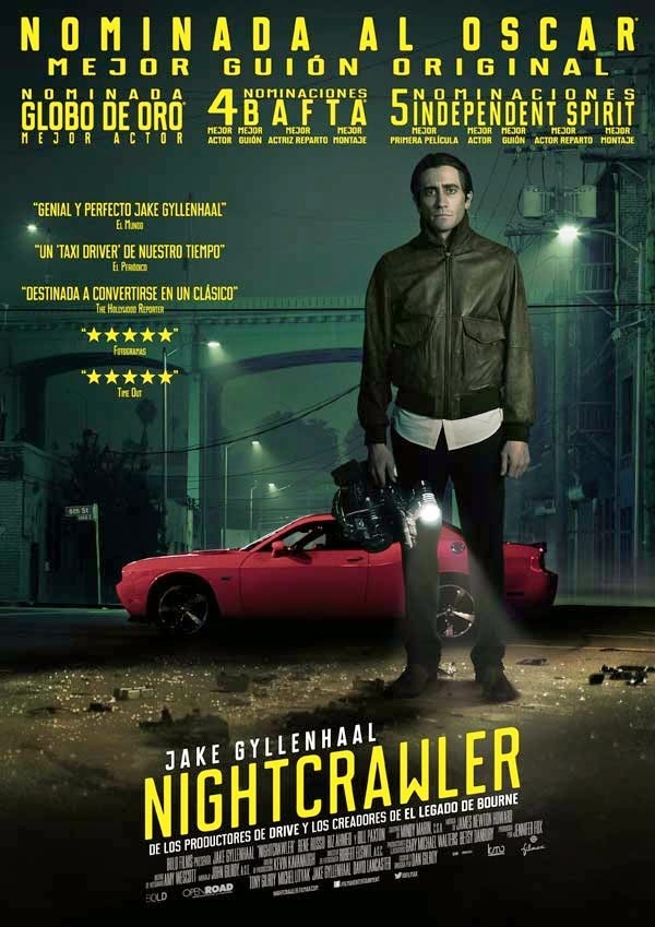 Bueno, esta es una película que será de culto ya, al igual que HER, y nos propone un interesante debate sobre los mass media. Los medios de comunicación, su manipulación, las imágenes que se manejan, lo que nos hacen ver, cómo conseguir atención y cuota de pantalla, ¿Utilizamos imágenes impactantes o solo informamos? El morbo, la carnaza de las cuotas televisivas y los medios se dan de la mano con su protagonista, un anti-social dispuesto a encontrar la noticia, aun a riesgo de su propia integridad y la de sus compañeros. Interesante también por la sociopatía que demuestra su personaje, interpretación brillante de Jake Gyllenhaal. Perfecta para debatir los límites de los medios de comunicación, la ética, los valores y hacia dónde nos lleva todo eso.