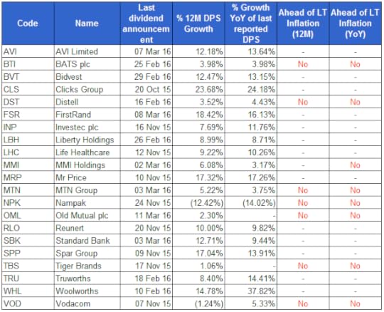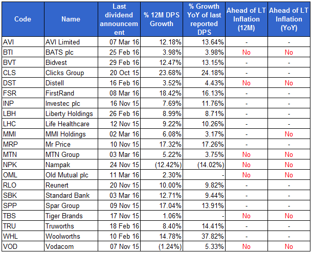 Today, AVI is the only company in my universe to pay a dividend. The R1.50 per share paid is 13.6% ahead of last year. The forward yield of AVI is 4.2% (Using R3.68 DPS Broker Consensus for 30 June 2016 from AVI website). This means the total annual dividend for the year ended 30 June 2016 is expected to be 4.2% of the current AVI price of R87.94 (closing price on 15 April 2016).