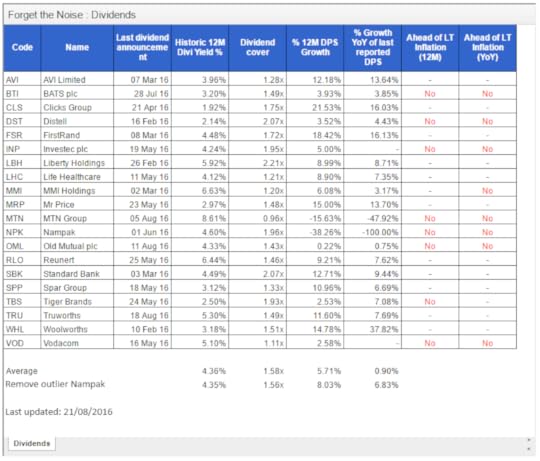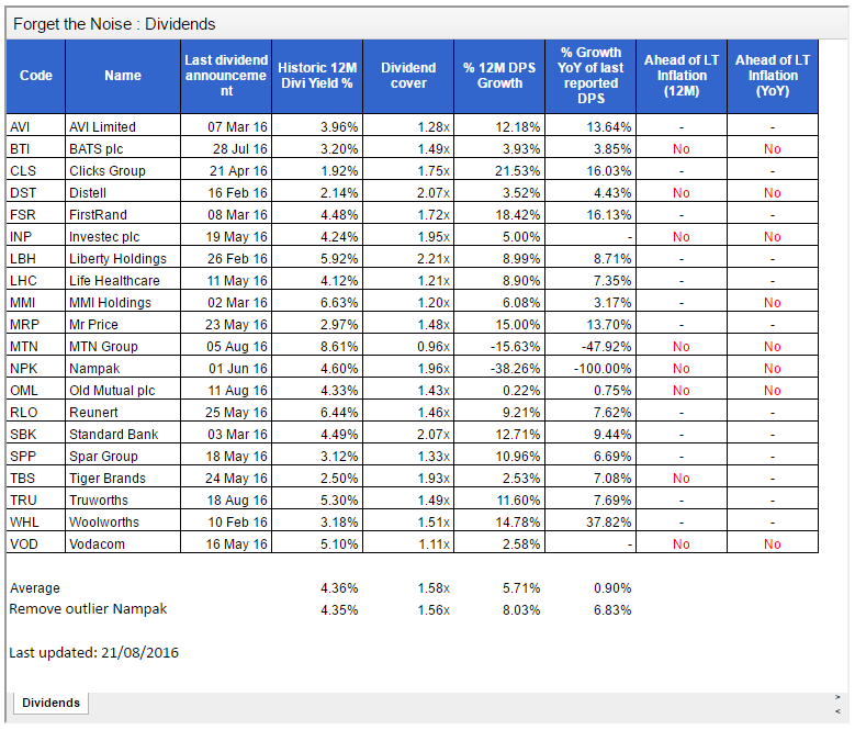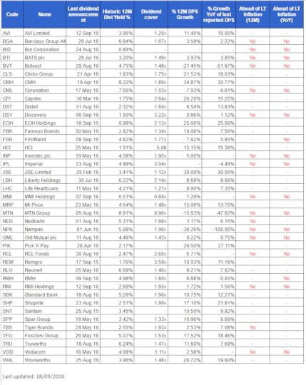 This week's update will be a short one as I am away. Truworths declared results this week. Annual DPS increased by an inflation-beating 12%. We will be back to normal next week. I hope to have expanded universe by then and provide you with a larger set of companies.Here is this week's updated table: