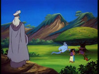 He goes on to offer wisdom and prophecy during several other adventures, one of which involves Mirage, the vengeful cat-woman (voiced by Bebe Neuwirth) who was responsible for Aladdin's childhood friend becoming a kidnapping monster of the night (but he gets better).