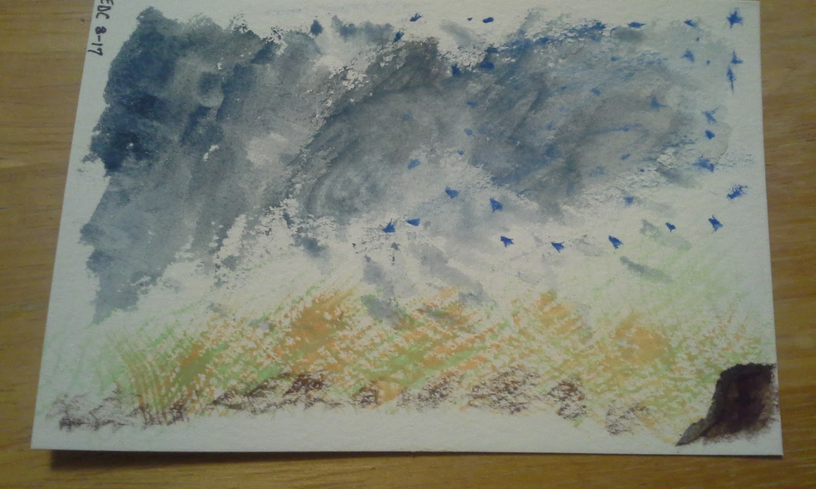The next two images are more postcards, both experimenting with some techniques and colors. The first was a chance to try out one of the brushes in my set that allows you to do fun textures (seen at the bottom). The second was trying out the browns and oranges in my pan set to see what I could/wanted to do for some of the other paintings later in this post.