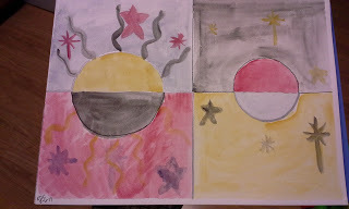Throughout the Albion books, Merlin uses "Stars" as his go-to exclamation, and at some point this will become the more encompassing, "Sun, moon, and stars." I decided to combine this phrase with the Colors of Magic: silver, black, gold, and red. I added an alternating scheme where each quadrant contained the other colors, not just its primary color (so the silver quadrant has a gold sun with black rays and red stars). (The moon quadrants didn't get all four colors because moonbeams just don't work that way.) I added some ink lines with a black fine point and a silver Sharpie to give the boundaries some distinction.