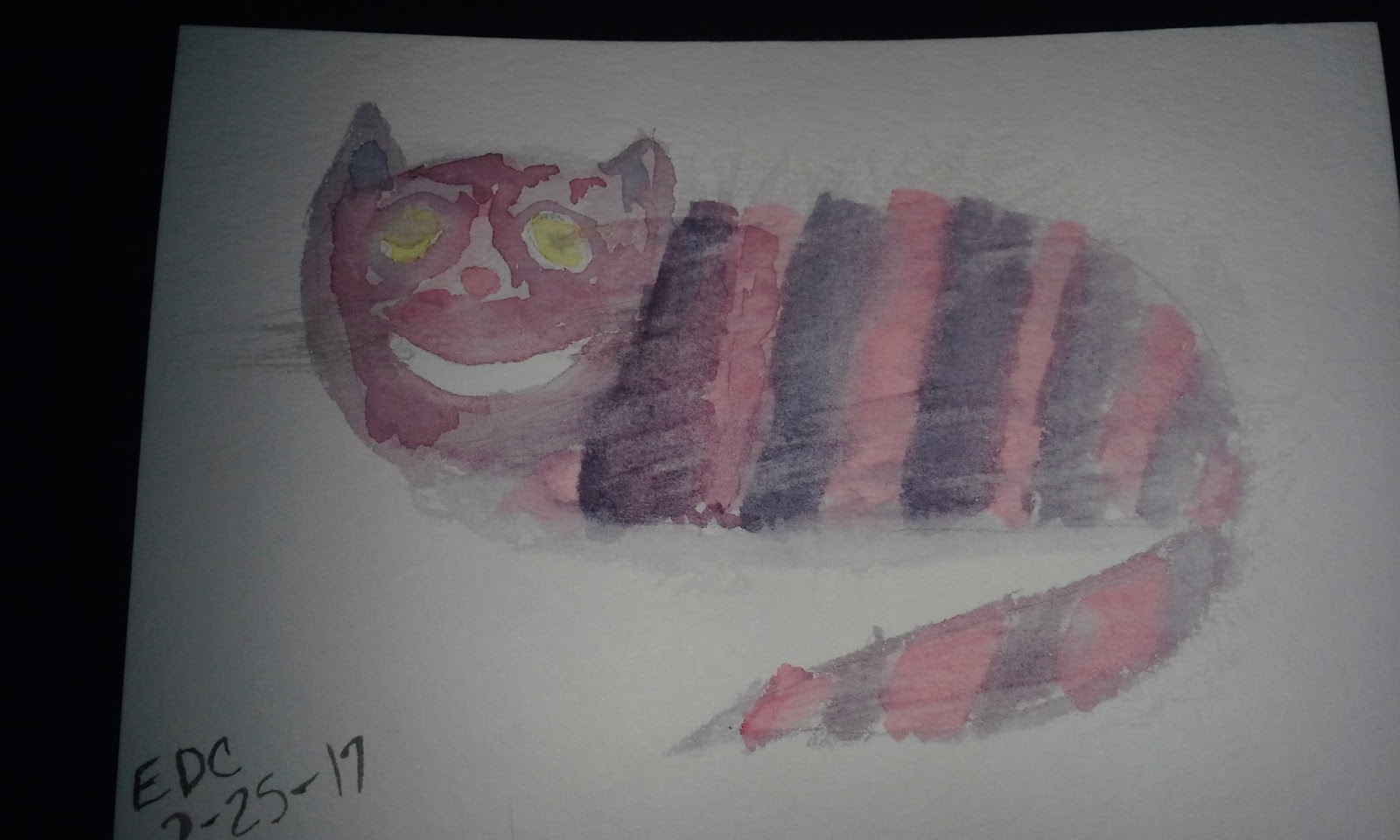 I loved how the Cheshire Cat turned out in last month's quote collage around the "c" in "Chance and careful planning" and wanted to try painting him on a larger scale. I'm pleased with the mixture of the colors this time around, though I had some trouble keeping the purple consistent. The grin remained pretty well defined too, considering I don't have any masking fluid to keep the space clear of paint. I didn't even attempt to paint the legs and paws because 1) I would have botched them terribly and 2) he's the Cheshire Cat, so he might just be phasing his limbs out of focus. We'll go with that.