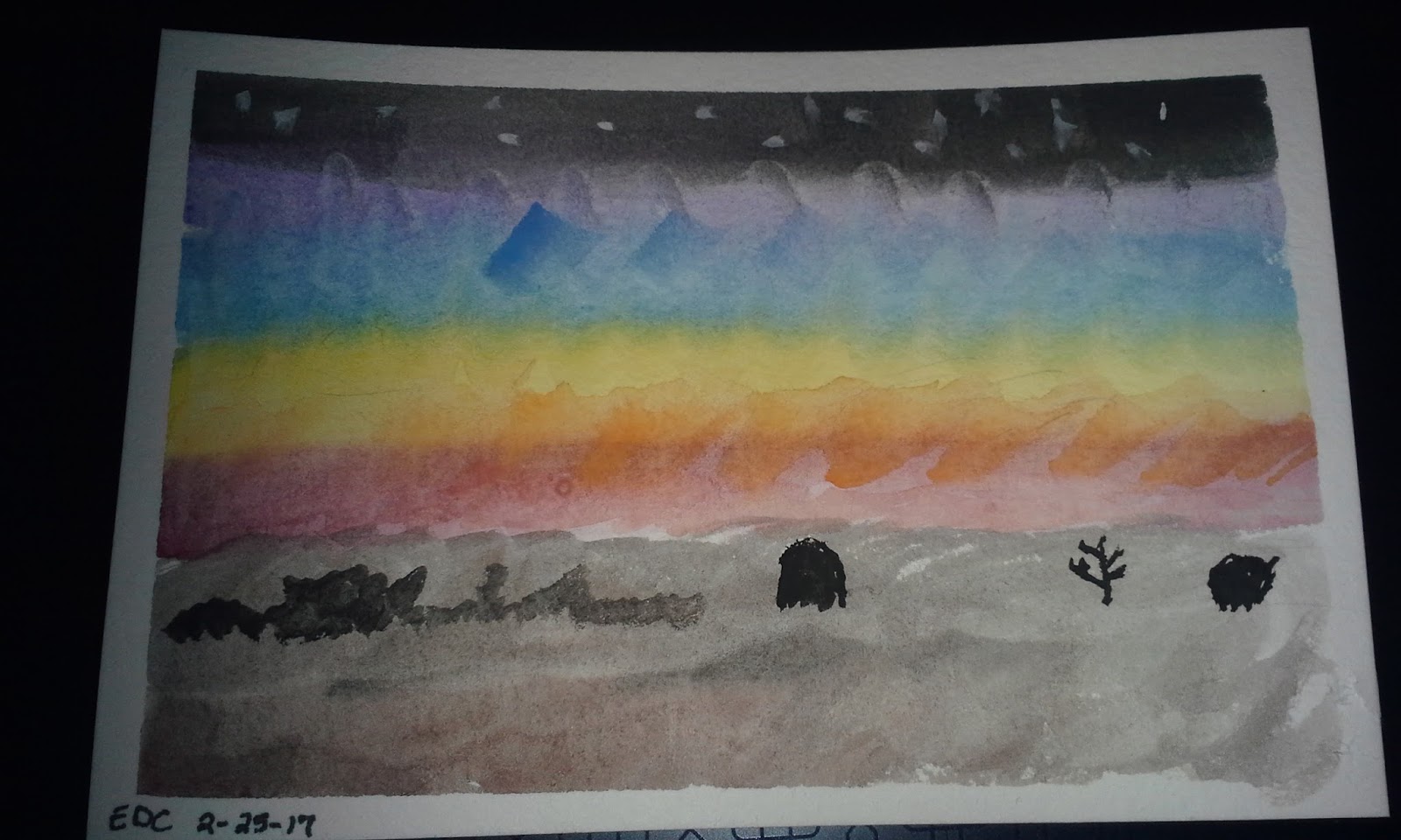 This beauty is on its way to my grandparents. I painted this wet on wet, and the colors blended a bit on the edges, but I meant to have them fade into one another more. The sunset I was attempting to recreate was far more pastel than this. I'll have to experiment with lightening my colors more. I also meant to have a fingernail-thin moon in the dark part of the sky, but as I said before, I don't have masking fluid, and it didn't happen. Still, I am pleased with how this one turned out.